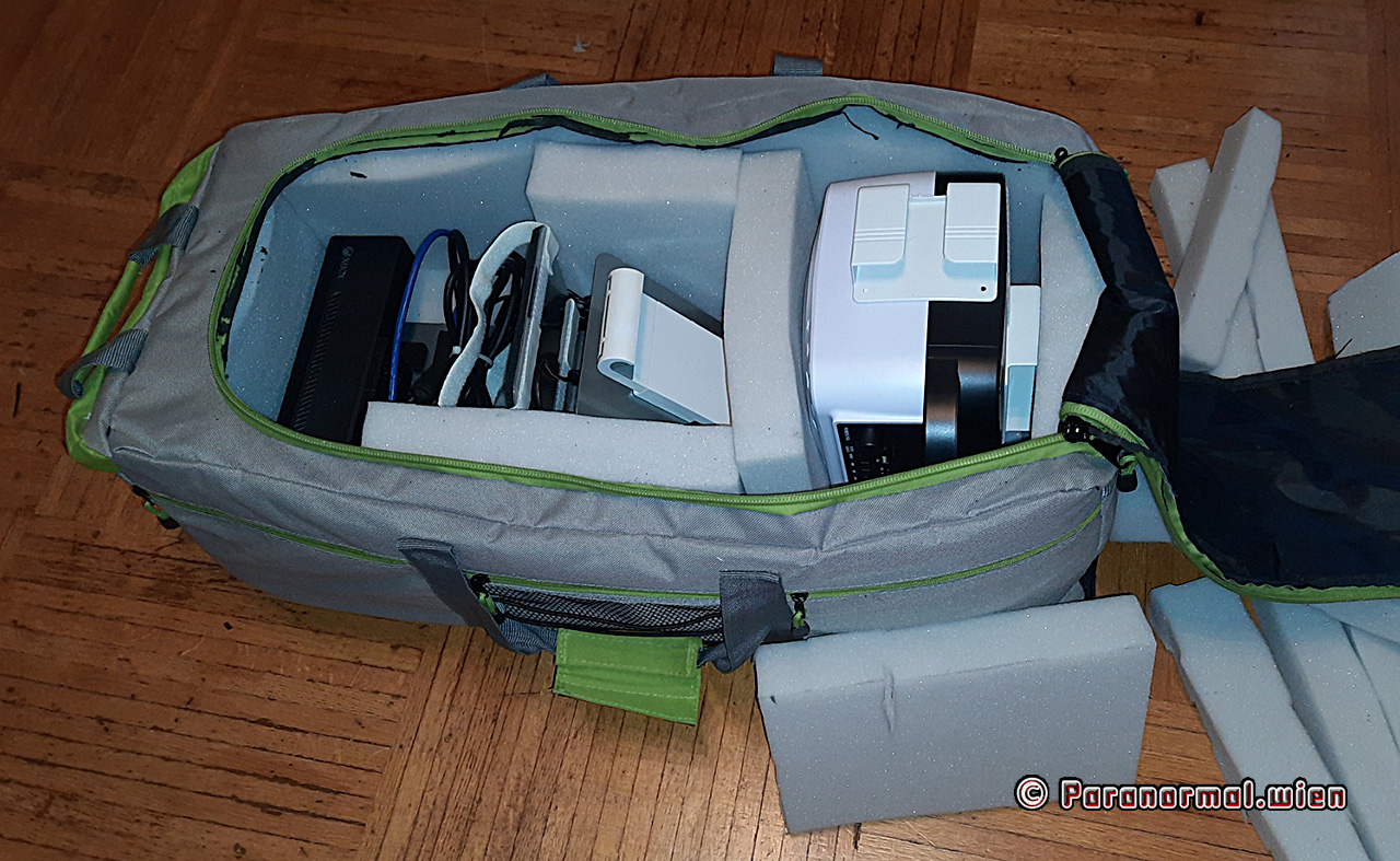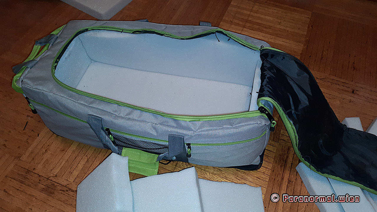 Schaumstoff und Klebstoff bestellt (den Schaumstoff habe ich allerdings etwas zu großzügig berechnet), das Maßband, Schere und Taschenrechner zur Hand genommen und losgelegt. Ich musste nach dem ersten Test noch ein wenig ab- und zuschneiden, aber dann hat es gepasst. Den Klebstoff brauchte ich allerdings nicht, da der Schaumstoff durch den gewählten Zuschnitt auch so in der Tasche hält.