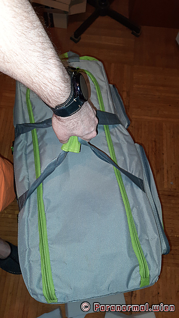 Durch die Rollen und den ausziehbaren Griff kann man die Geräte bequem herumrollen und falls das nicht geht, trägt man das Ganze einfach ganz normal (dadurch, dass die Tasche nicht so breit ist, hängt sich das Gewicht auch nicht so an). Ich würde sagen: Bastelprojekt erfolgreich abgeschlossen