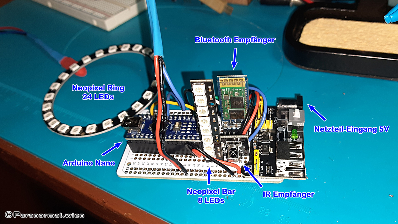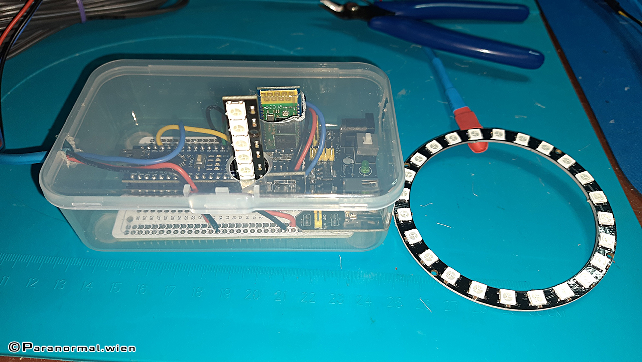 Alle LEDs lassen sich nun bequem über die Fernbedienung steuern bzw. ausschalten. Die App habe ich erweitert und angepasst. Die durchsichtige Box passt nicht ganz (die Neopixel-Bar und das Bluetooth-Modul schauen oben raus), aber ich wollte nicht extra dafür etwas Passenderes ordern.